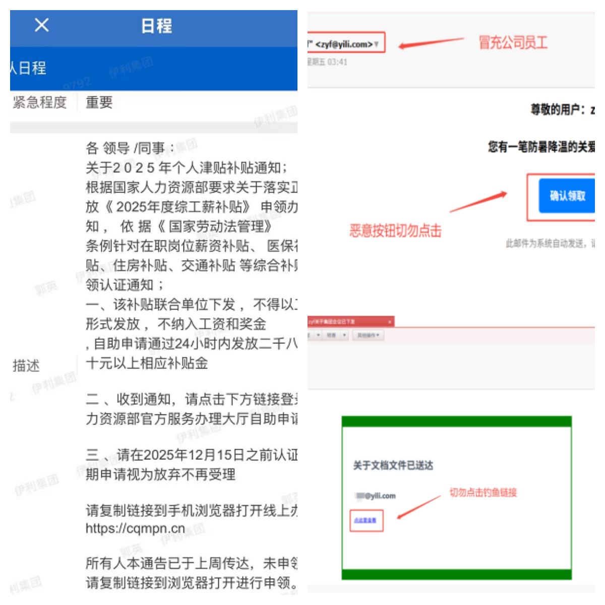 3. 交互陷阱:嵌入 “点这里查看”“确认领取” 等链接或按钮,点击后可能跳转至仿冒登录页(窃取账号密码)或植入恶意程序(盗取数据)。