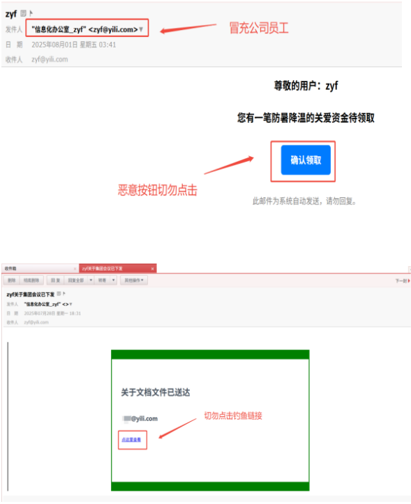 近期,公司监测到冒充内部职能部门(如人力资源、信息化办公室等)的钓鱼攻击频发,不法分子以“年度工薪补贴”“综合津贴”“集团会议通知”“文档送达”“防暑降温关爱资金领取”等为诱饵,通过诱导点击链接或按钮实施诈骗!特此向全体员工发出安全警示:一旦收到此类邮件、会议日程通知等,请务必直接删除,切勿打开附件或点击链接,更不要泄露任何账号和密码信息!确保个人信息安全,谨防上当受骗。