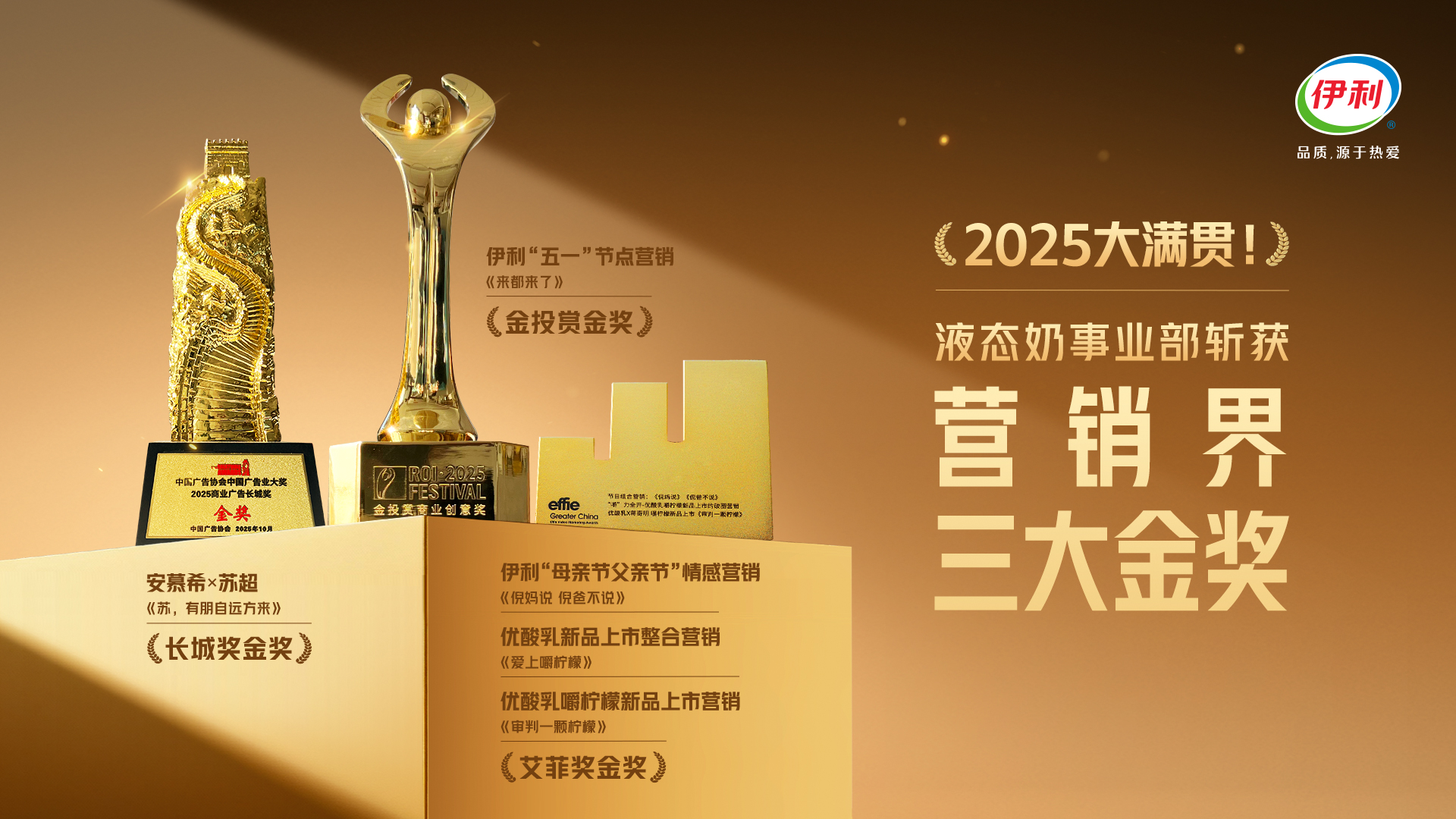 近日,随着艾菲奖获奖名单正式公布,2025年度营销领域三大权威奖项 ——金投赏、长城奖、艾菲奖已悉数揭榜。液态奶事业部旗下多个子品牌,从全国超11000件参赛作品中强势突围,一举斩获三大赛事金奖。
