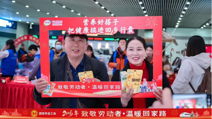 新春将至,年味渐浓,无数在外拼搏的返乡务工者踏上团圆归途。近日,西安分公司主动联动液奶事业部、奶酪事业部,联合合作伙伴陕西御品轩烘焙,积极参与由西安总工会、西安铁路局主办的2026年“致敬劳动者 温暖回家路”新春公益活动,在西安北客站为前往甘肃、四川、河南等方向的近千名返乡务工人员,送上牛奶搭配面包的暖心早餐礼包,以公益行动践行企业社会责任,用营养关怀温暖每一位劳动者的团圆路,同时传递伊利牛奶适配早餐场景的营养优势。