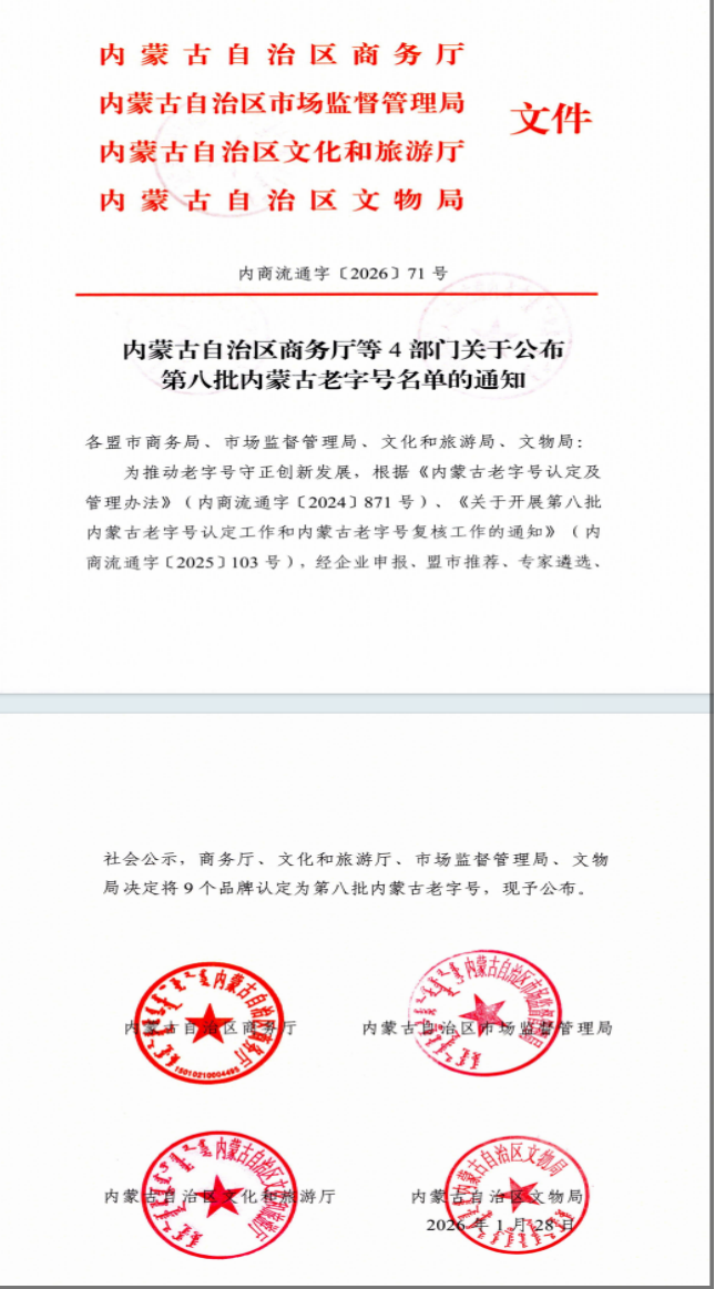 “内蒙古老字号”是由内蒙古自治区商务厅、市场监督管理局、文化和旅游厅、文物局联合认定的权威品牌荣誉,旨在遴选历史悠久、拥有世代传承的产品、技艺或服务,具有鲜明民族或地域文化特色和深厚历史底蕴,且在自治区内具有广泛社会认同、良好信誉和品牌价值的本土企业,其核心作用与意义在于推动老字号在商贸流通、消费促进、质量管理、技术创新、品牌建设、文化传承等领域发挥示范引领作用,承载内蒙古地域文化与民族记忆,为企业注入品牌公信力与历史价值,助力本土品牌高质量发展、走向全国和世界。