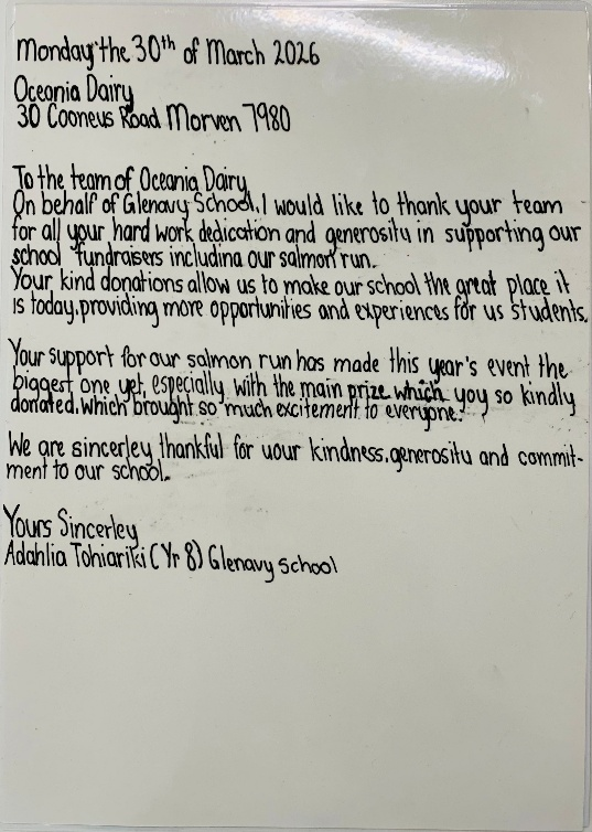 近日,澳新业务单元收到了来自格雷纳维学校的一份特别礼物——一张手工致谢卡,以此感谢澳新业务单元对该校2026年“鲑鱼跑”筹款活动的大力支持。随致谢卡一同送来的,还有该校学生阿达利亚亲手烘焙的蛋糕。这份充满心意的举动温暖了整个乳业基地,也让大家深刻感受到社区联结的深厚意义。